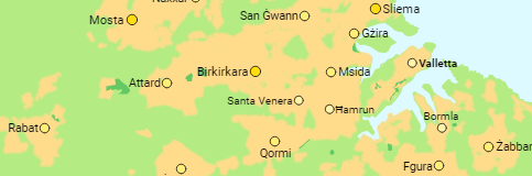 The Maltese islands as well as all localities with more than 5,000 inhabitants.