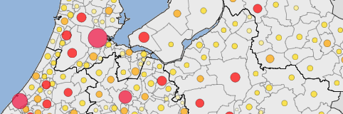 The provinces as well as all urban centers (bevolkingskernen) of more than 15,000 inhabitants.