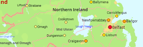 The countries of the UK as well as all cities and towns with a population of more than 50,000.