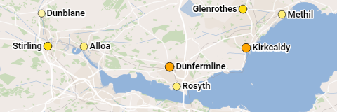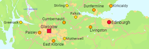 All urban areas ("settlements") in Scotland that have a population of more than 15,000.
