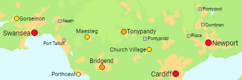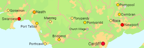 All Welsh urban areas (i.e. more or less continuously built-up areas) of more than 15,000 inhabitants.